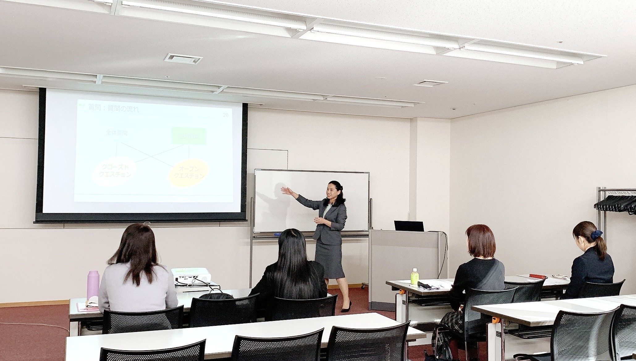 ビジネスマナーの指導者としての研修力向上を目指す全3回コースの第3回目を、2月15日(日)にウィルあいちにて行いました。今回は、ビジネスマナーを指導する上での「伝わりやすさ」を高め、質問や実技による双方向のコミュニケーションで理解を深めるさまざまなテクニックをご紹介しました。